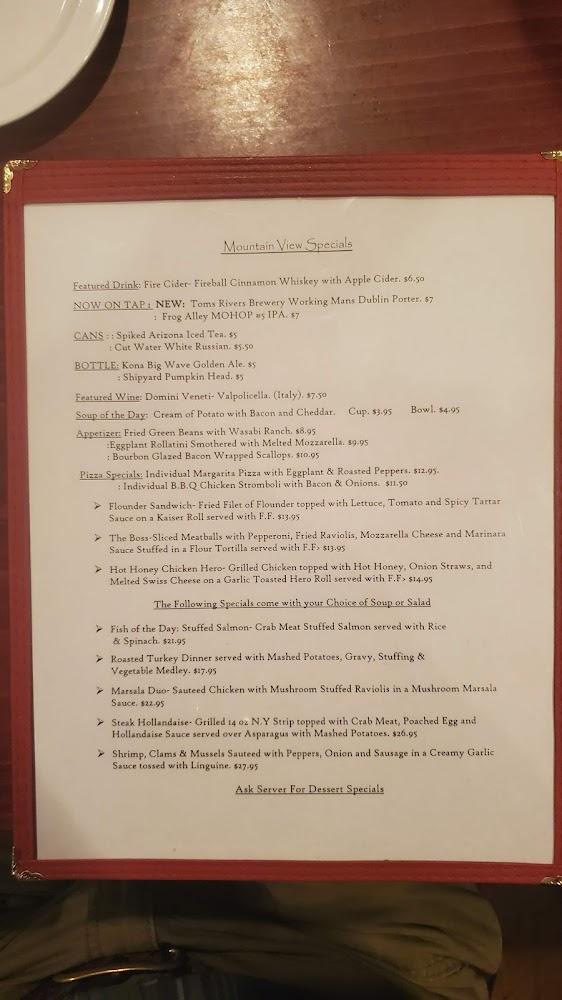 Welcome to Mountain View, your go-to Italian restaurant located at 241 Stone School House Rd, Bloomingburg, NY. Enjoy our delightful offerings, including excellent coffee, handcrafted cocktails, and decadent desserts, all within a warm and relaxed atmosphere. With a diverse selection of beers and wines, there's something for everyone. We provide convenient services such as takeout, dine-in, and delivery, making it perfect for solo lunches or group dinners. Our accessible facilities ensure a comfortable experience for all guests. Join us for a meal that celebrates local specialties and enjoy our "happy hour" discounts on food and drinks. Come savor the flavors at Mountain View!